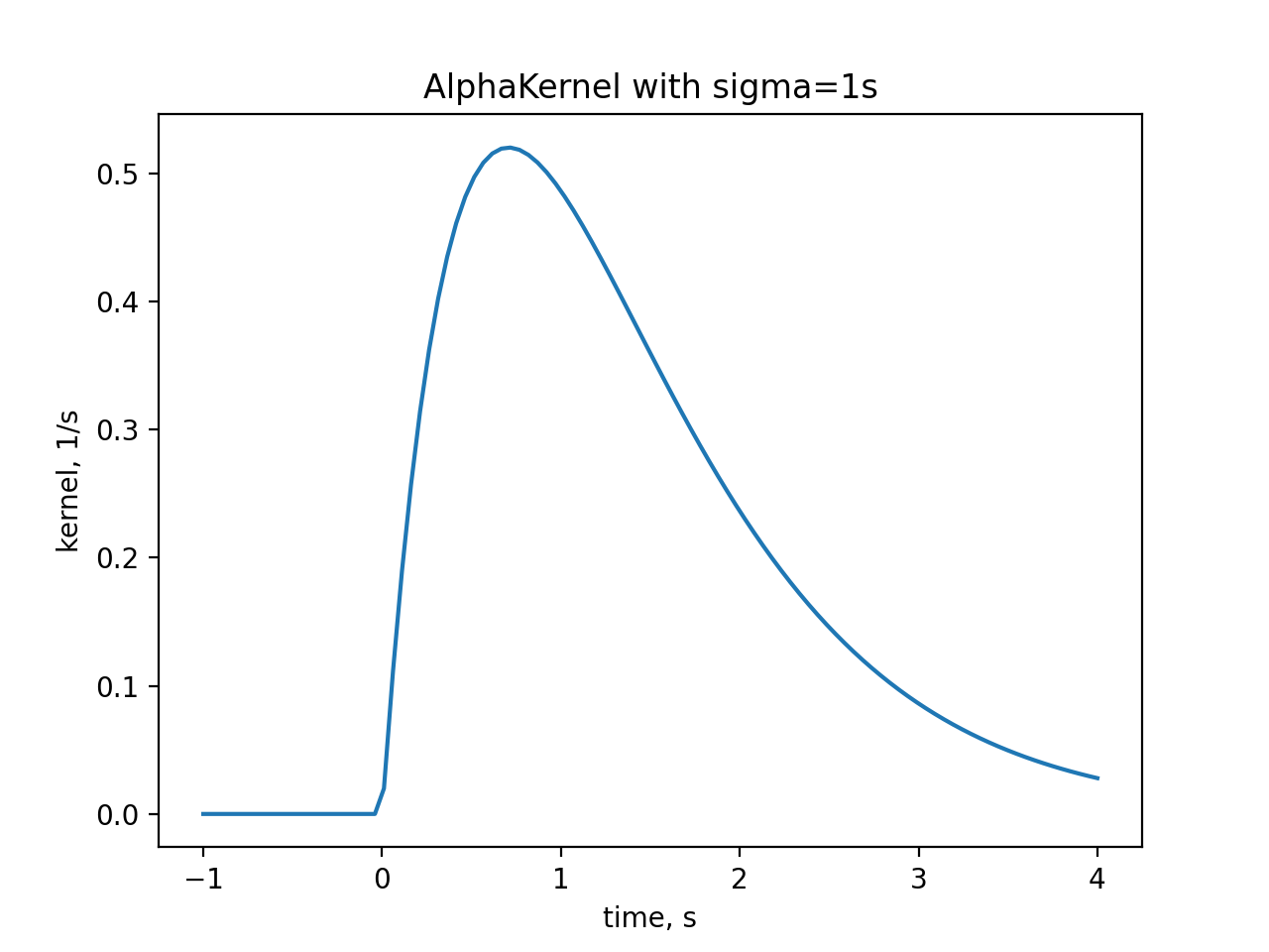\[\begin{split}K(t) = \left\{\begin{array}{ll} (1 / \tau^2) \ t\ \exp{(-t / \tau)}, & t > 0 \\ 0, & t \leq 0 \end{array} \right.\end{split}\]with \(\tau = \sigma / \sqrt{2}\).